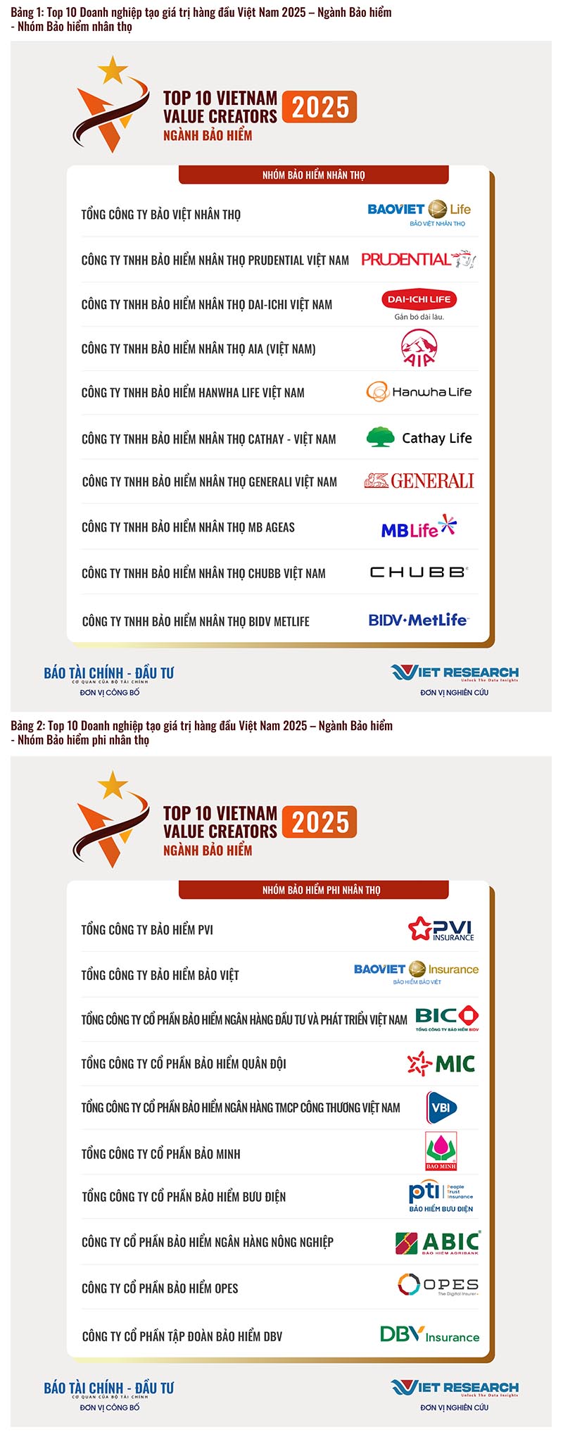 Trong khuôn khổ Chương trình Nghiên cứu toàn quốc về các Doanh nghiệp tạo giá trị hàng đầu Việt Nam, Viet Research phối hợp với Báo Tài chính – Đầu tư (Bộ Tài chính) công bố Top 10 Doanh nghiệp tạo giá trị hàng đầu Việt Nam 2025 – Ngành Bảo hiểm. Đây là những doanh nghiệp tiên phong trong việc tạo dựng giá trị cho nền kinh tế và xã hội, thể hiện qua: quy mô và tốc độ tăng trưởng; lợi nhuận và đóng góp cho ngân sách; môi trường, chính sách và phúc lợi lao động; cam kết về ESG và đổi mới sáng tạo.